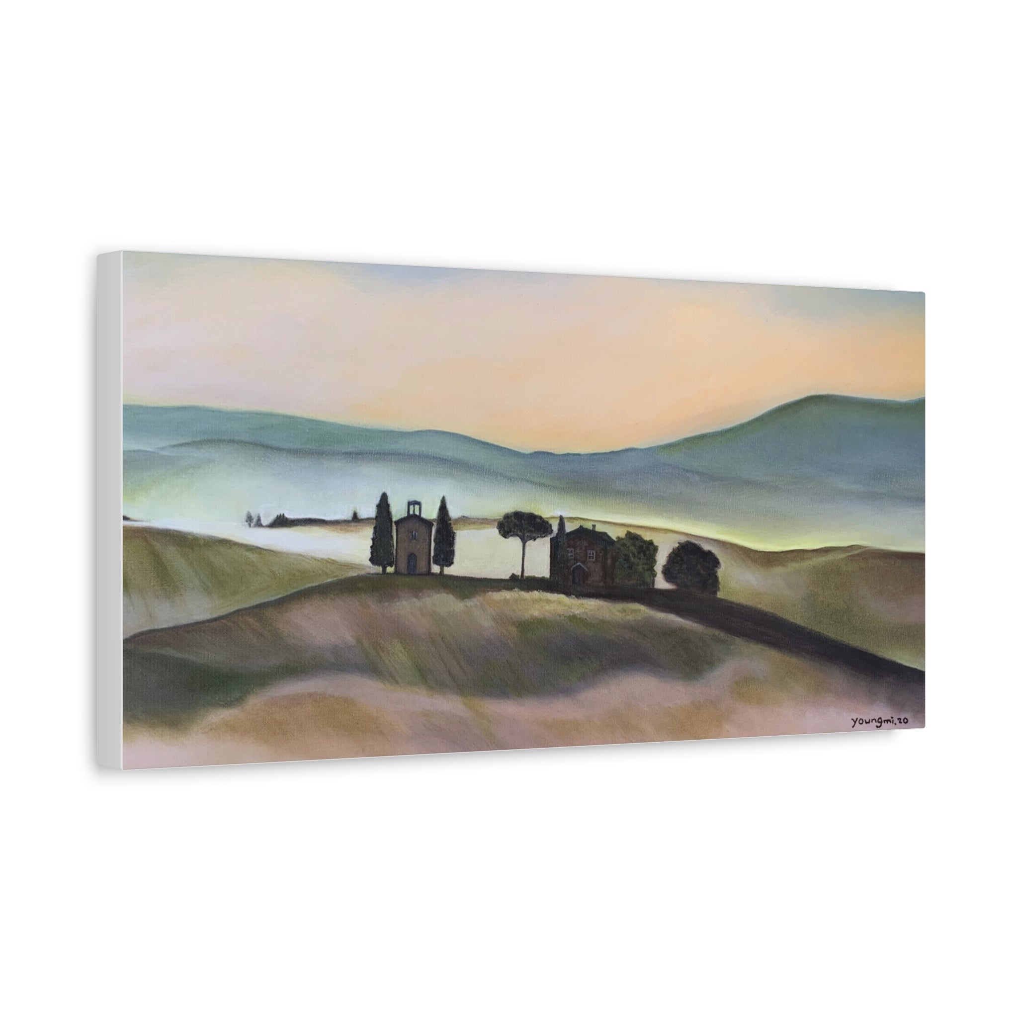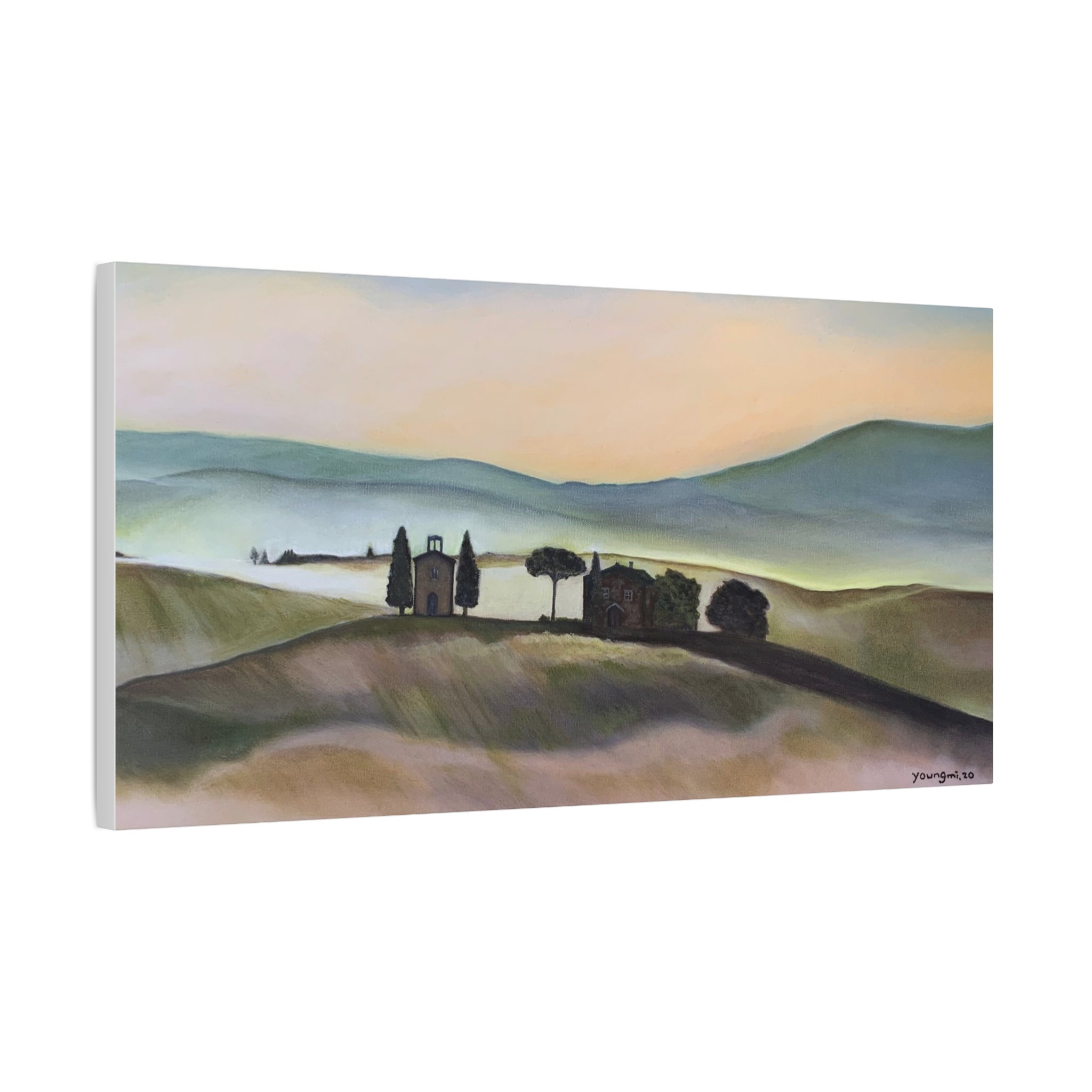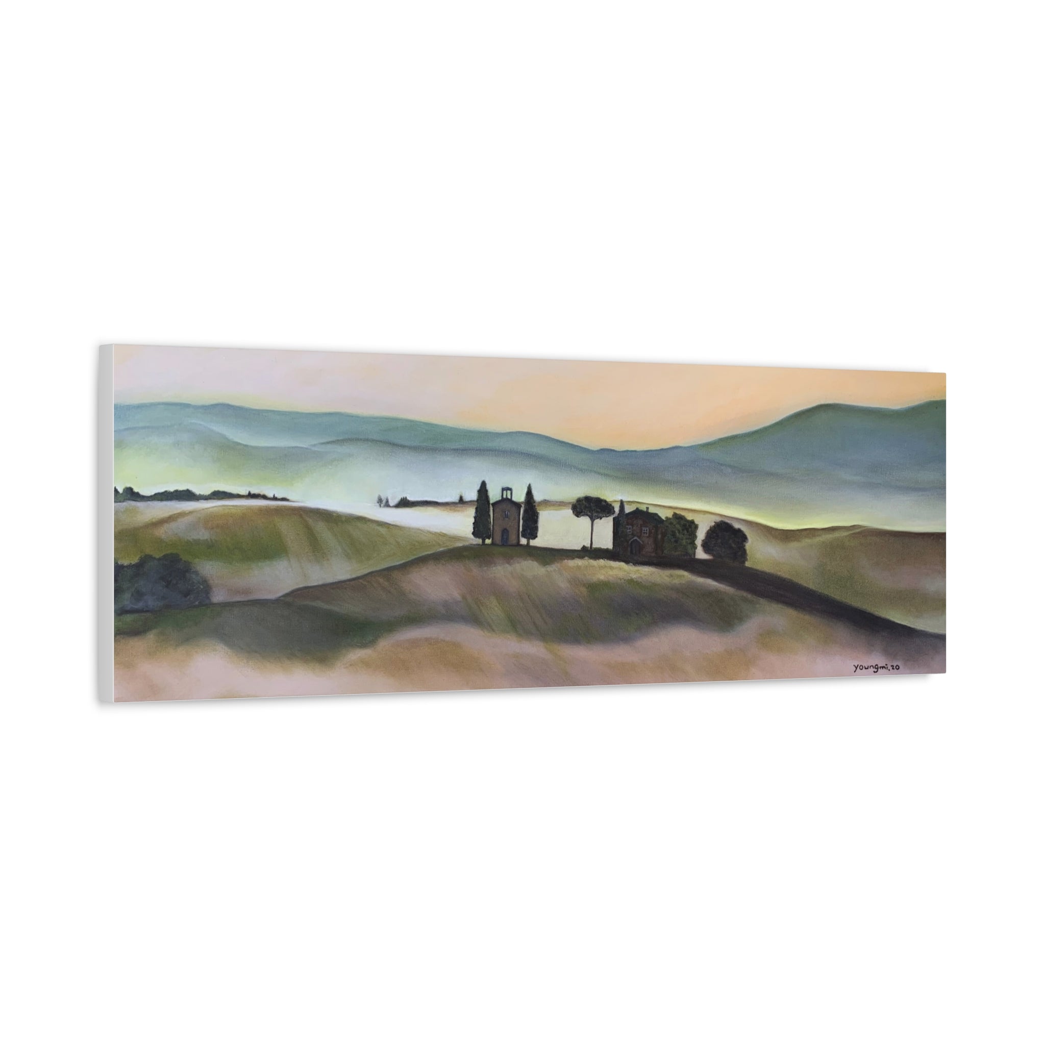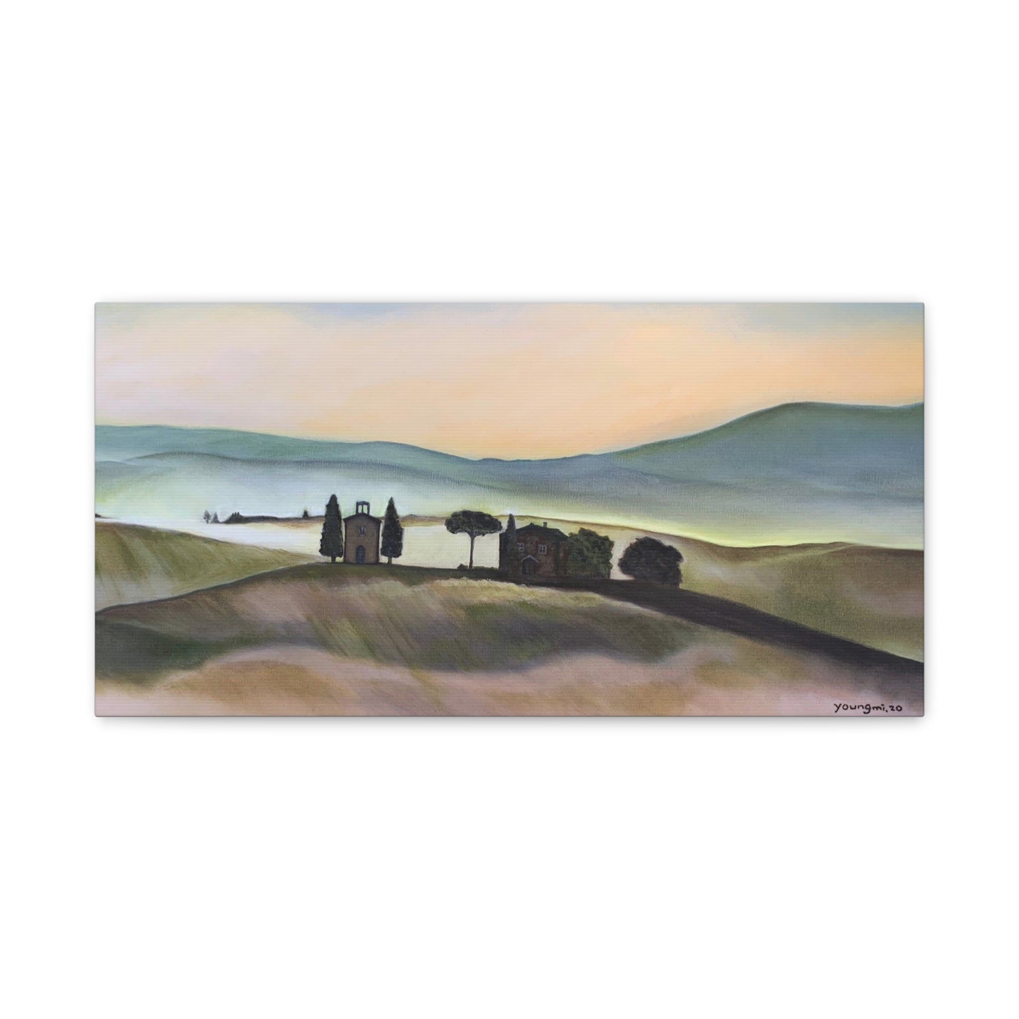 Young Mi was inspired to create this piece from the photography artwork of our great friend Buzz Covington. When Young Mi saw his "Early morning mist creeping through the Val d'Orcia cascades down the hills surrounding the Chapel of the Madonna di Vitaleta" she really wanted to paint it. This print is perfect for any room in your home. Our standard canvas is made from a finely textured artist-grade cotton substrate which consistently reproduces image details with outstanding clarity and detail.