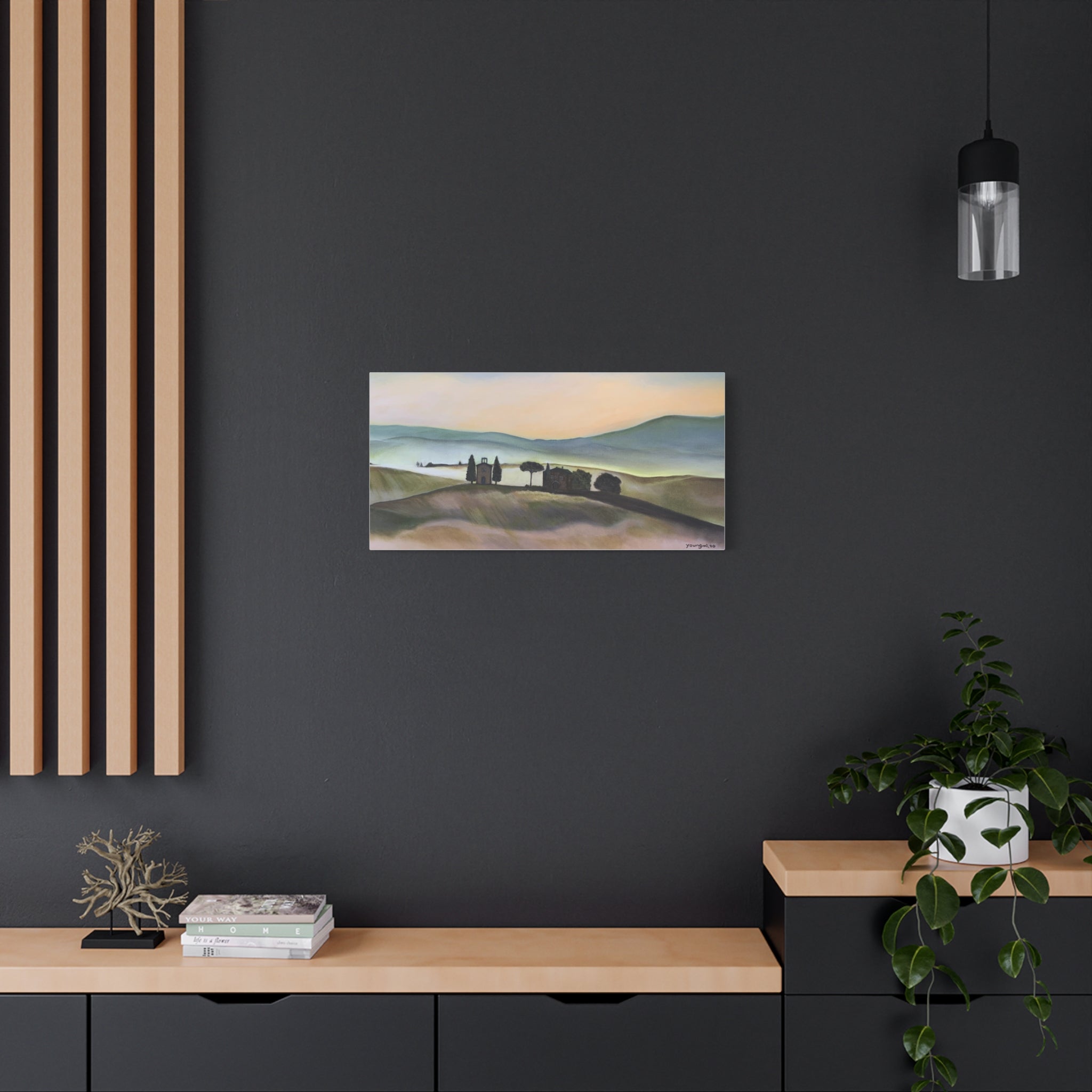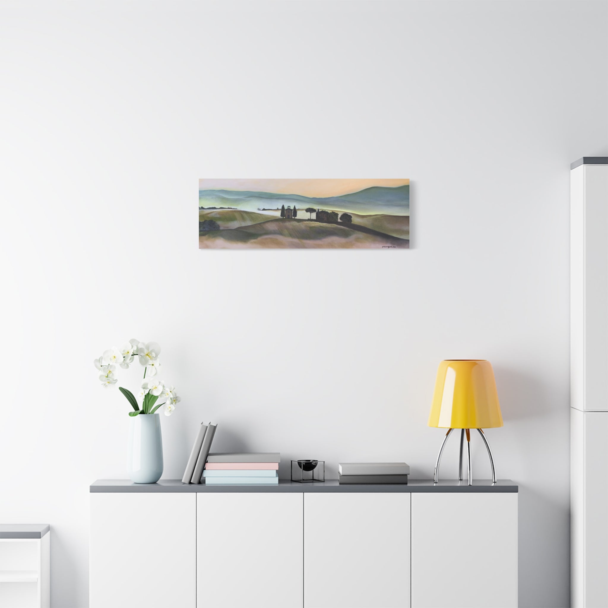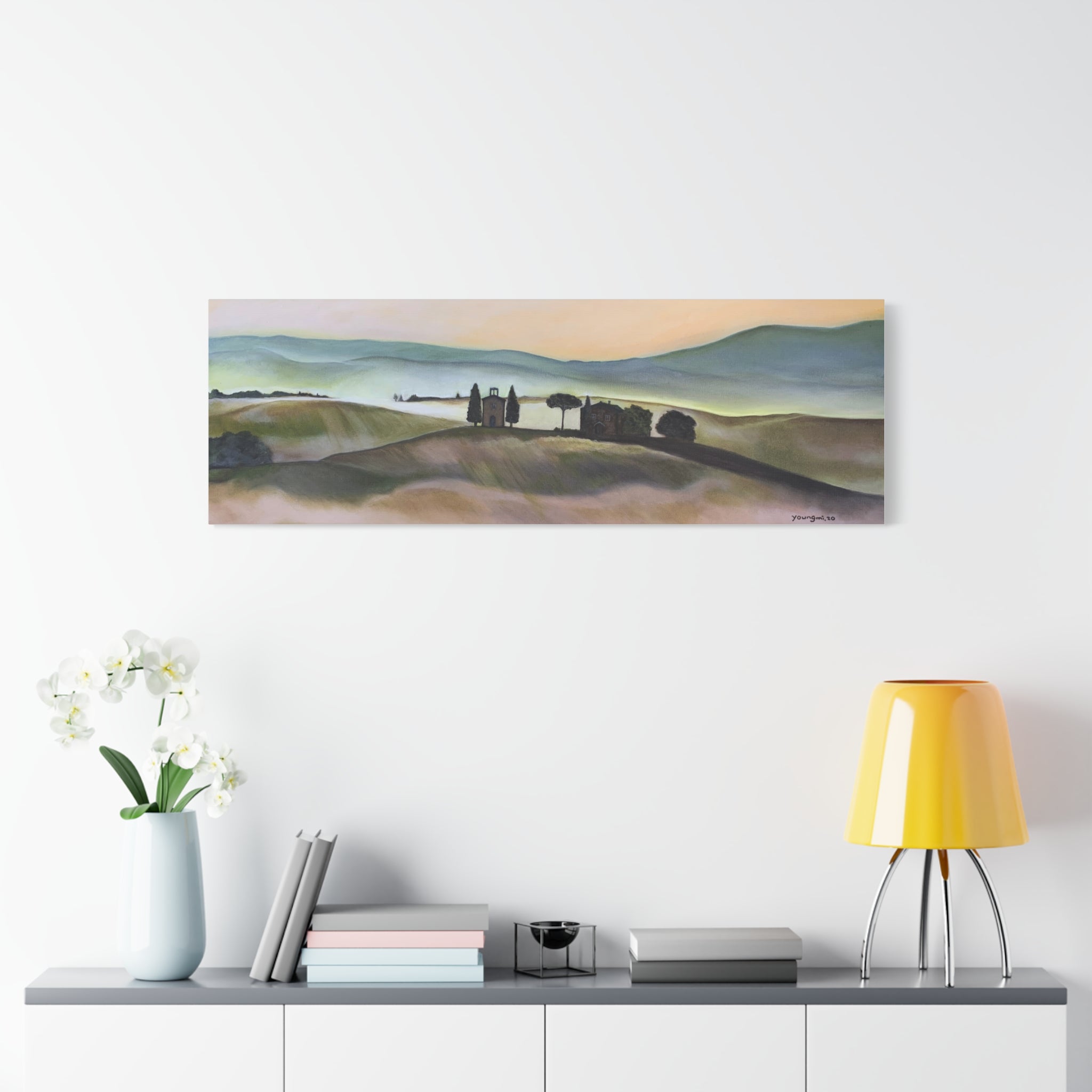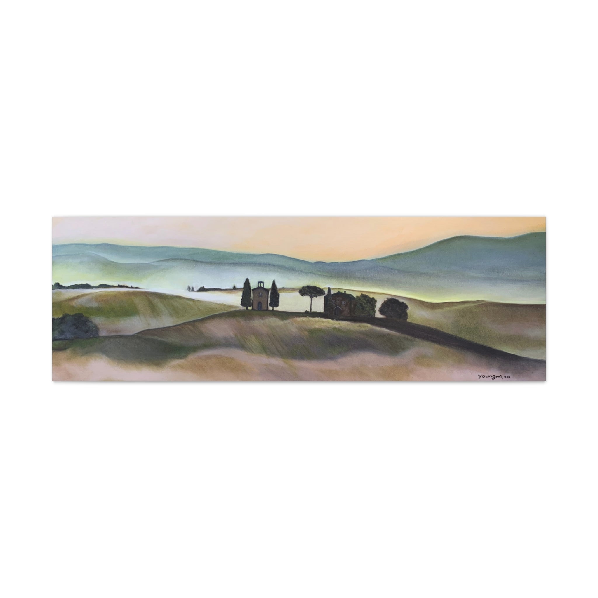 Young Mi was inspired to create this piece from the photography artwork of our great friend Buzz Covington. When Young Mi saw his "Early morning mist creeping through the Val d'Orcia cascades down the hills surrounding the Chapel of the Madonna di Vitaleta" she really wanted to paint it. This print is perfect for any room in your home. Our standard canvas is made from a finely textured artist-grade cotton substrate which consistently reproduces image details with outstanding clarity and detail.